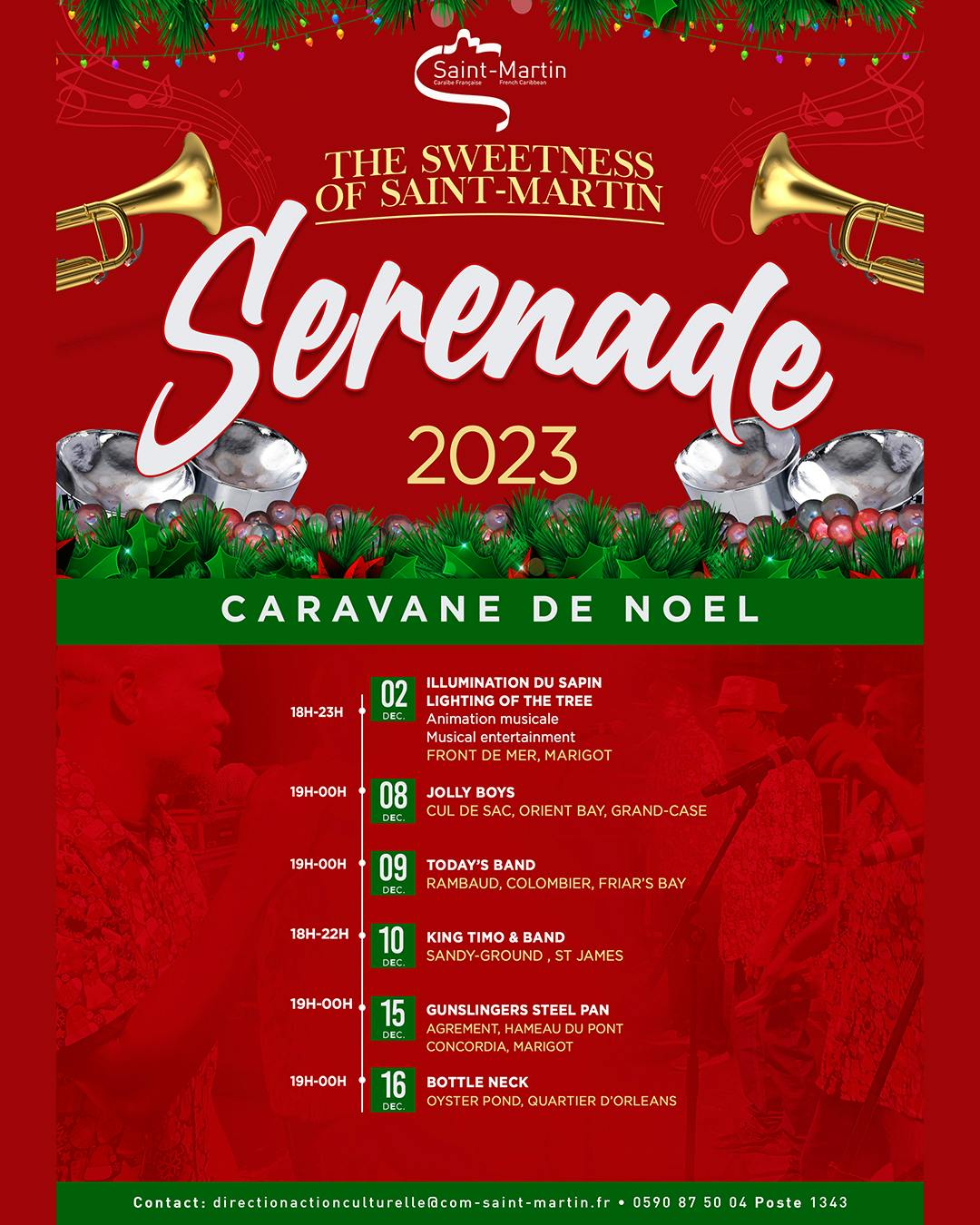 La Collectivité de Saint-Martin débute les festivités de Noël 2023, avec l'illumination du sapin de Noël ce samedi 2 décembre sur le front de mer à Marigot, suivi par les Sérénades dans les Quartiers du 08 au 16 décembre, de 18h à minuit d’Oyster Pond à Sandy Ground.