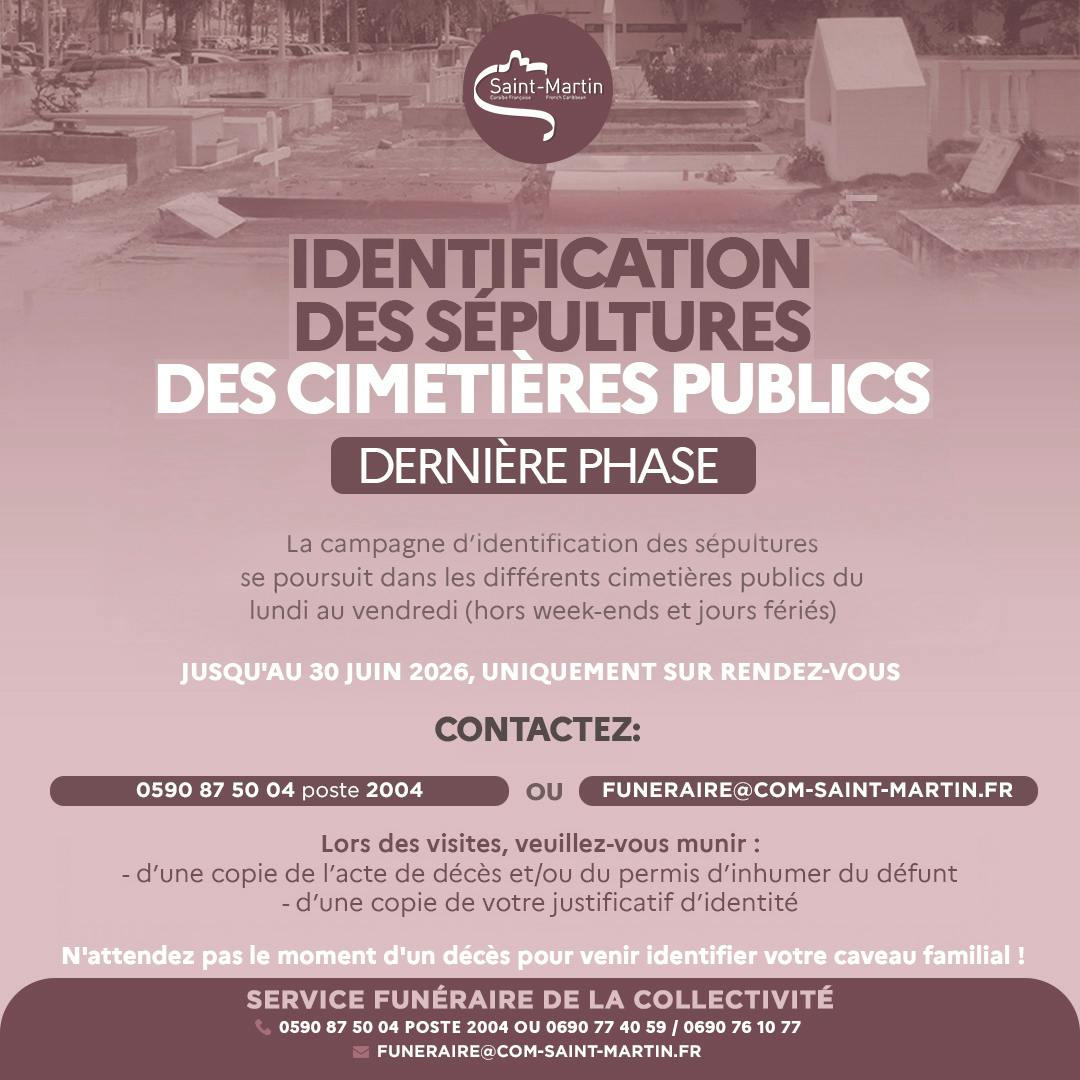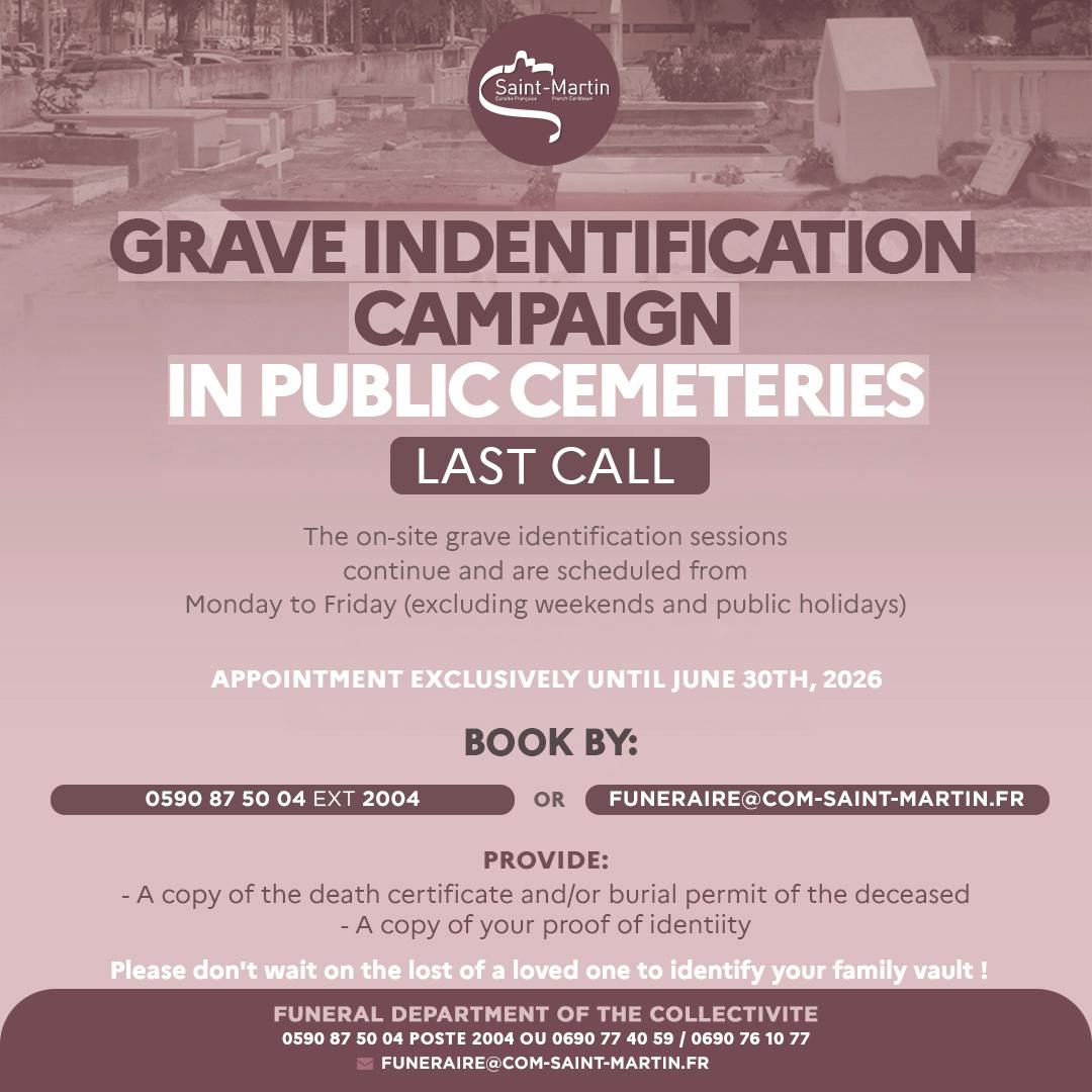 The Collectivity of Saint Martin hereby informs the public that the Funeral Service is going into the last phase of the grave identification campaign within the various public cemeteries. The deadline is set for June 30th 2026.