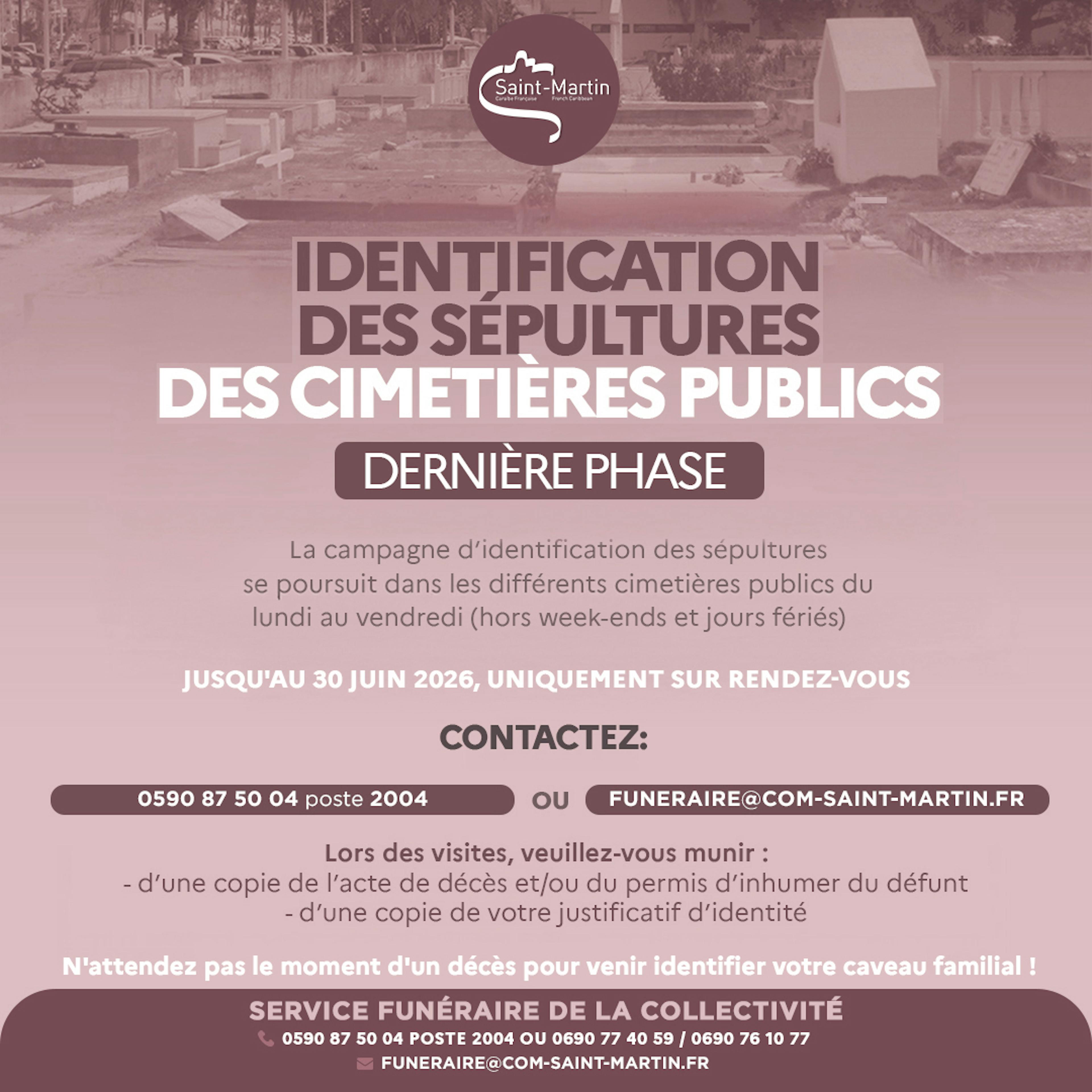La Collectivité de Saint-Martin rappelle aux administrés que le Service Funéraire poursuit la campagne d’identification des sépultures au sein des différents cimetières publics, et entame la dernière phase qui se termine le 30 juin prochain.