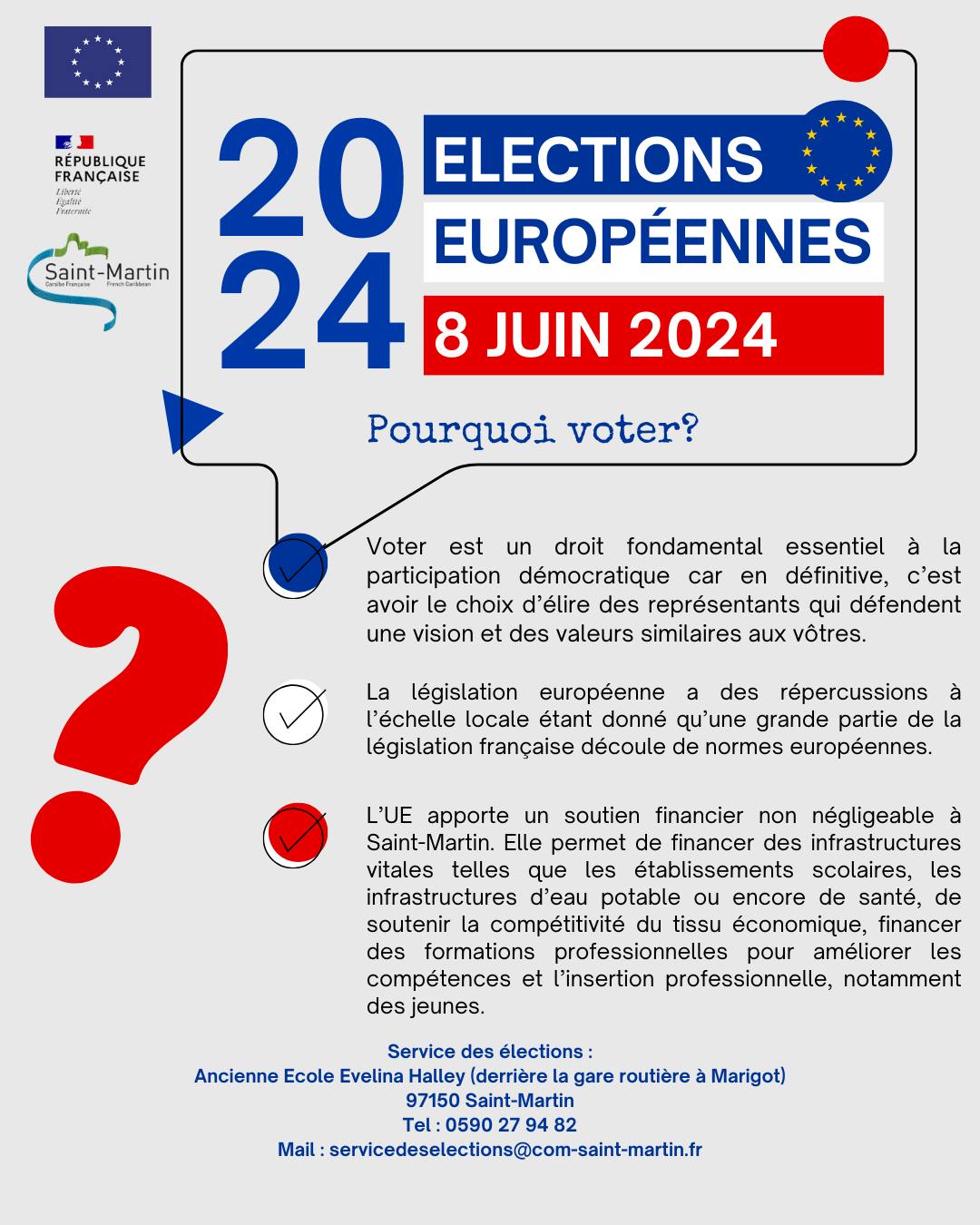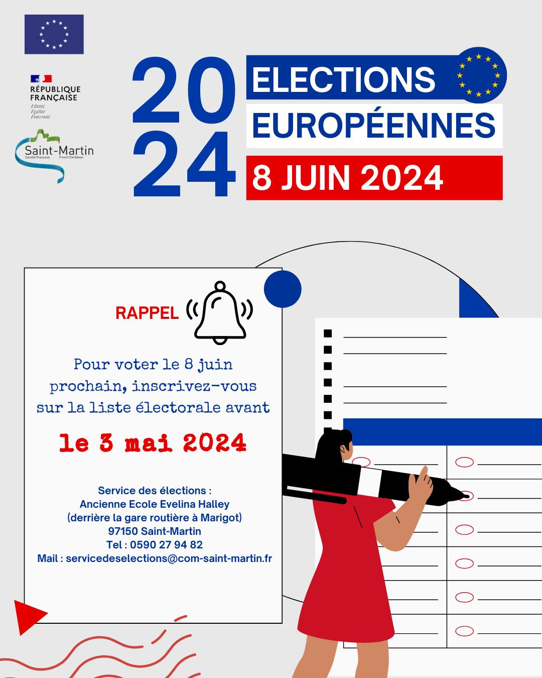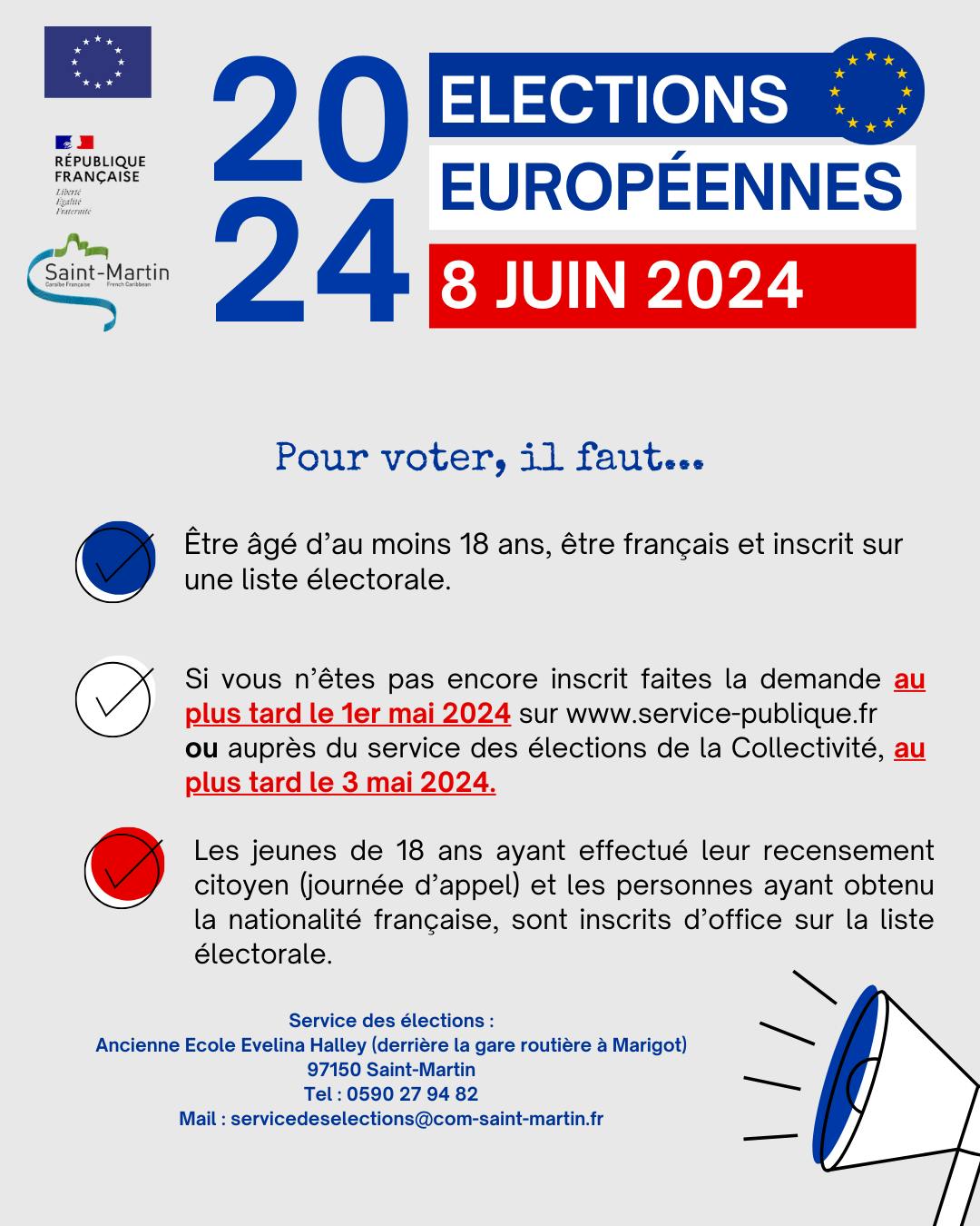 Les prochaines élections européennes auront lieu le 8 juin 2024 à Saint-Martin et le 9 juin en France hexagonale. Si vous n’êtes pas déjà inscrit sur la liste électorale, la Collectivité de Saint-Martin vous invite à le faire dès maintenant.