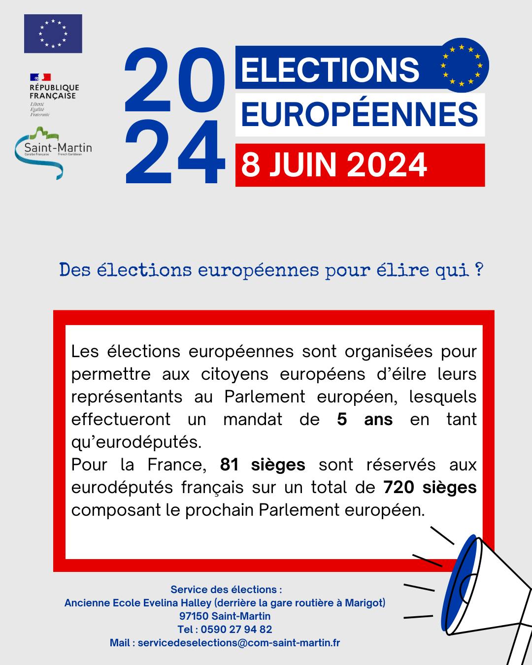 Votre vote européen compte, prenez le temps de vous inscrire ou de vérifier que vous figurez sur la liste électorale de Saint-Martin. Les Parlementaires européens (Eurodéputés) effectuent un mandat de 5 ans. 81 sièges sont réservés aux eurodéputés français sur un total de 720 sièges.