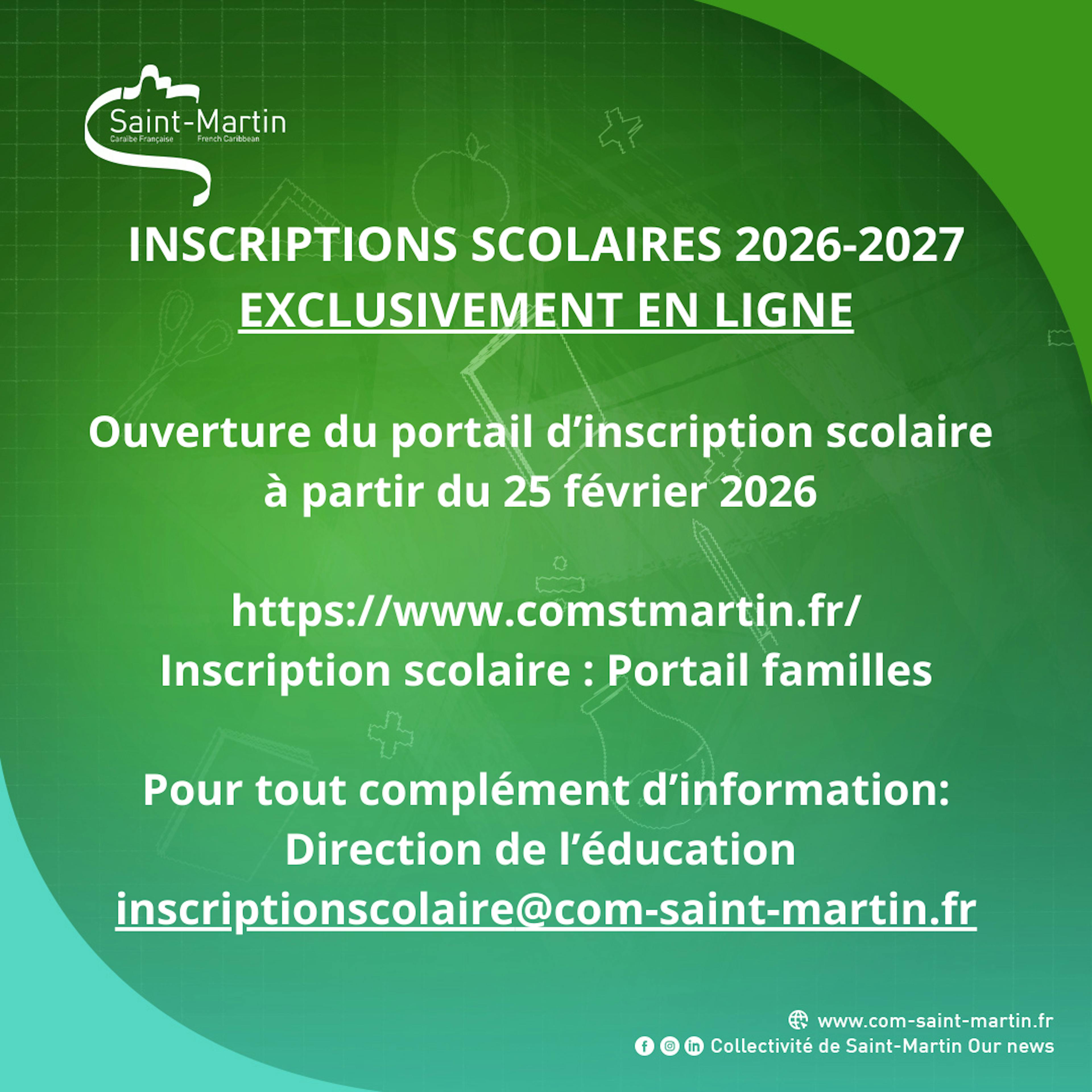La Collectivité de Saint-Martin informe les parents d’élèves de l’ouverture du portail Famille pour les inscriptions en école maternelle et en classe de cours préparatoire (CP), à compter du 25 février 2026, pour l’année scolaire 2026-2027.