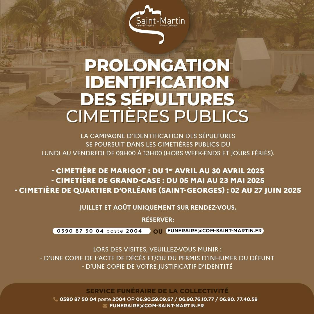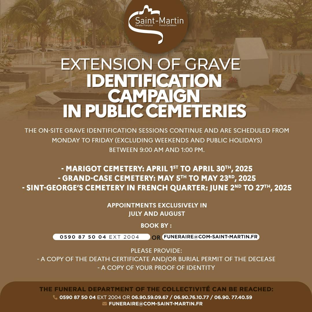 02 avril 2025La Collectivité de Saint-Martin informe la population que le Service Funéraire prolonge la campagne d’identification des sépultures au sein des différents cimetières publics. Cette campagne aura lieu du 1er avril jusqu’au mois d’aout 2025.