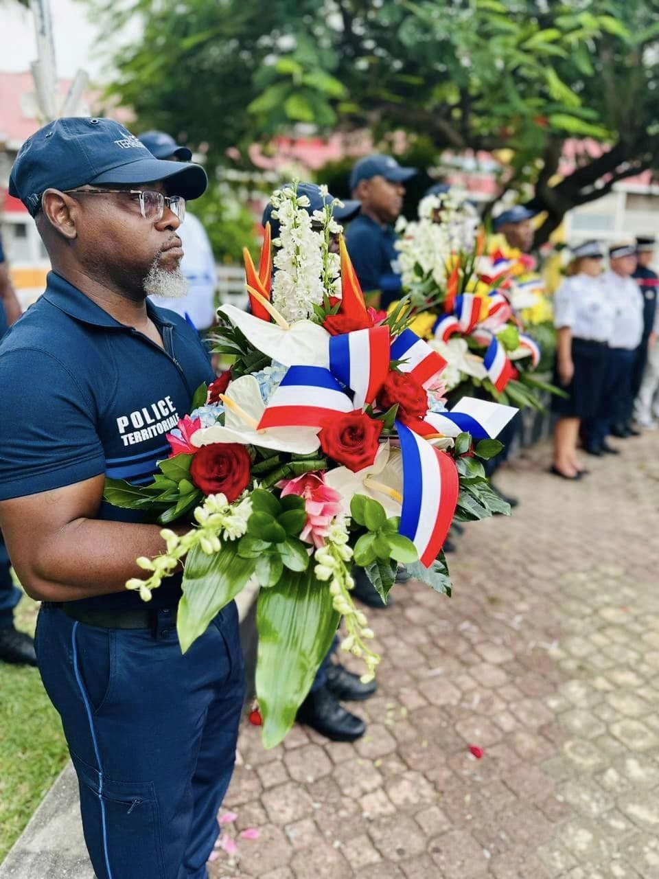 Mrs. Bernadette Davis, 2nd Vice-President, laid a wreath of flowers on Wednesday, May 8, in tribute to the victims of the Second World War, alongside the State representative, Fabien Sésé, Vice-President Michel Petit, law enforcement officers and veterans.