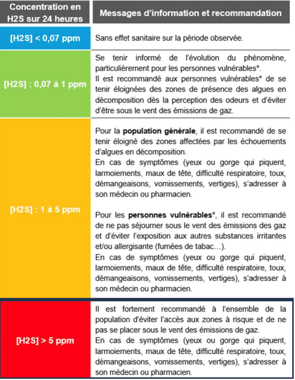 Des mesures de concentration en sulfure d’hydrogène (H₂S), gaz naturellement émis lors de la décomposition des algues, ont dépassé ponctuellement les 5 parties par million (ppm) sur ces deux sites au plus près des opérations de collecte. Ces niveaux, bien que localisés, justifient l’application du principe de précaution afin de préserver la santé des riverains, des usagers du littoral et des agents mobilisés.