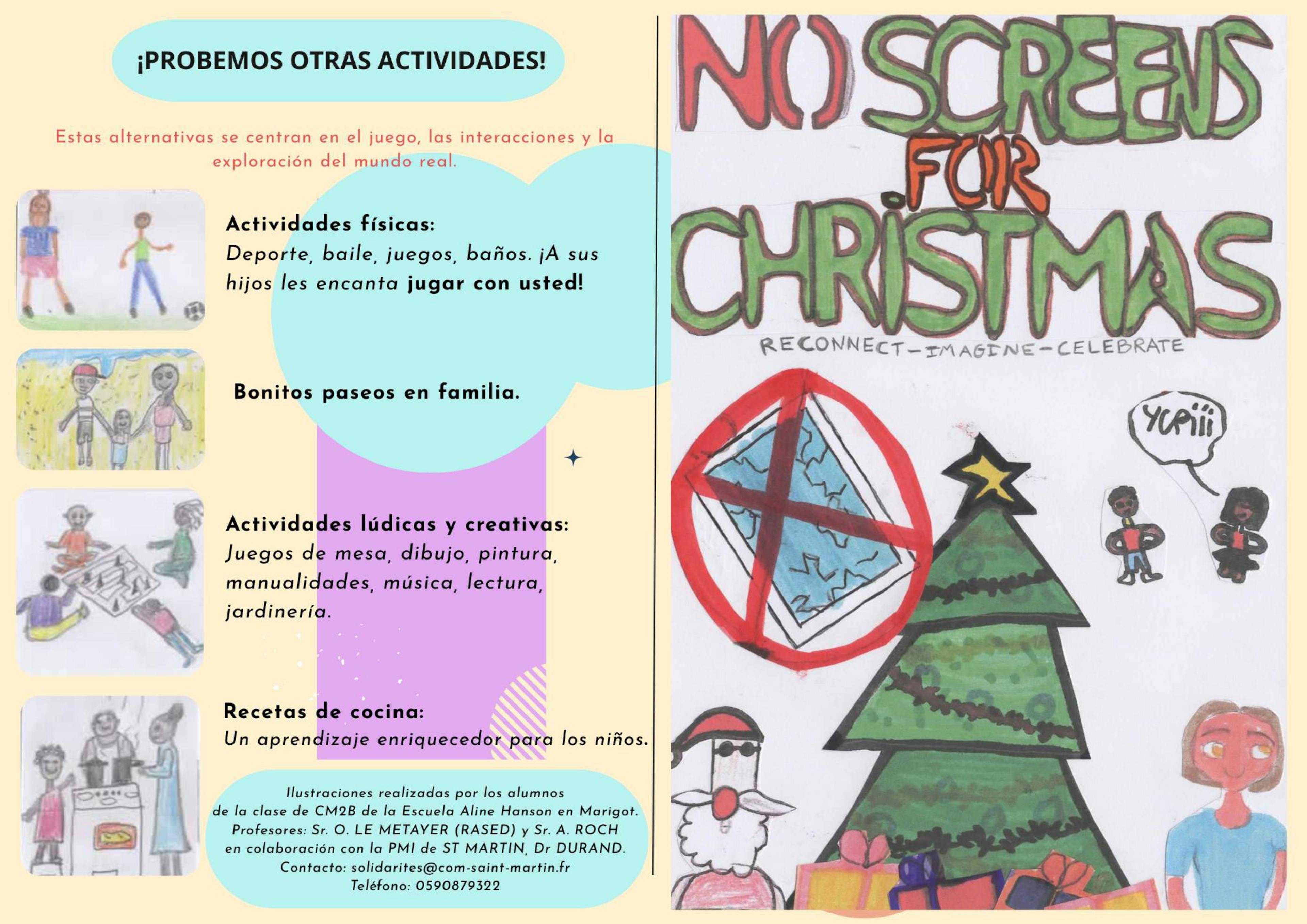 En partenariat avec Mr LEMETAYER, enseignant en école primaire, un flyer a été préparé pour les jeunes enfants dans les trois langues les plus parlées à Saint-Martin, intitulé NO SCRENN FOR CHRISTMAS. (Ci-joint).